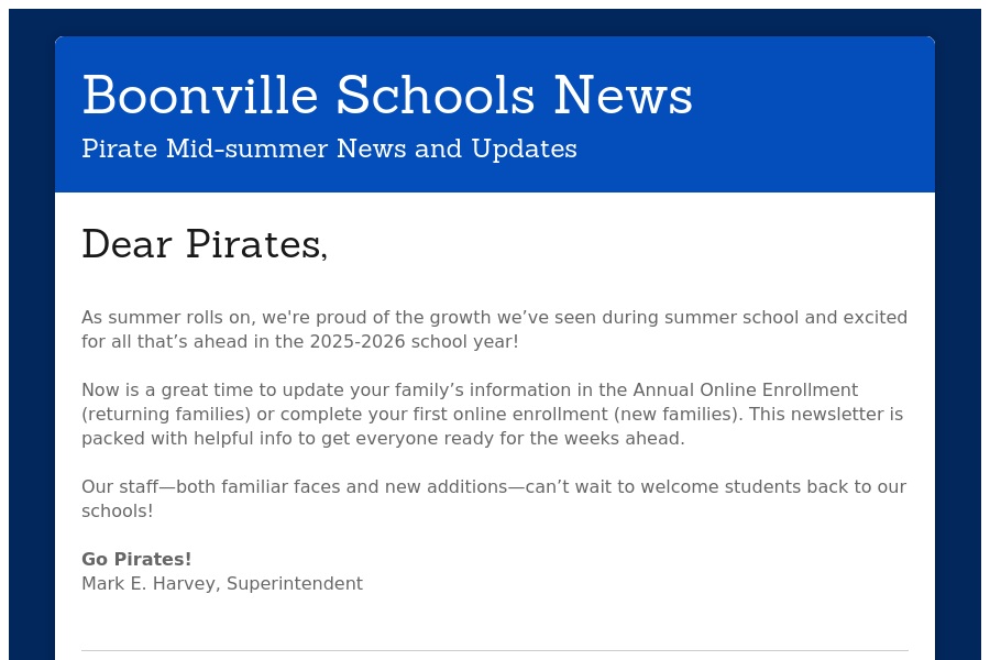 Boonville Schools News Pirate Mid-summer News and Updates Dear Pirates, As summer rolls on, we're proud of the growth weve seen during summer school and excited for all tha. . .