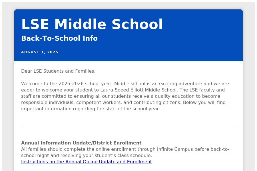LSE Middle School Back-To-School Info August 1, 2025 Dear LSE Students and Families, Welcome to the 2025-2026 school year.Middle school is an exciting adventure and we . . .
